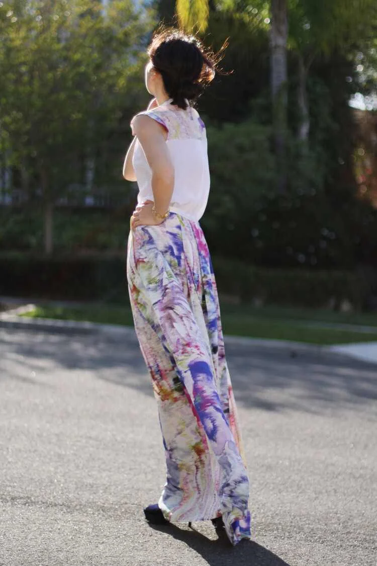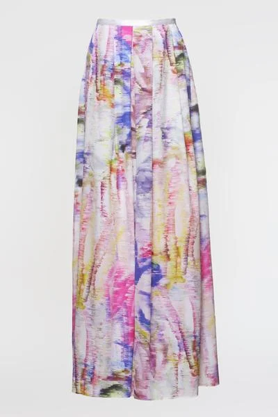 Flowy, high-waisted silk skirt with Rosewater print and pleats