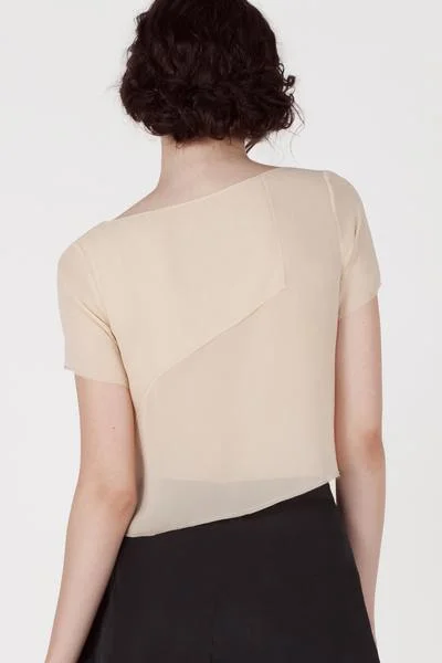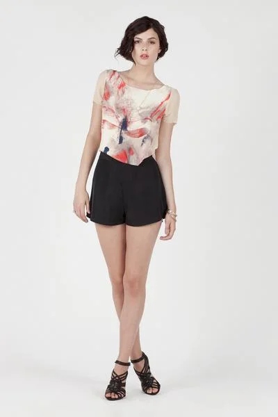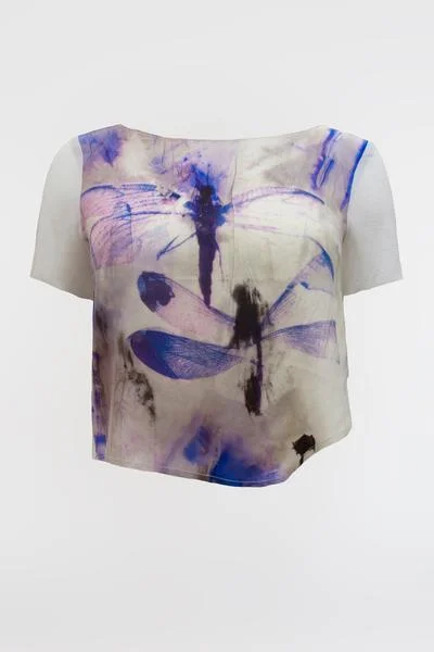 Dragonfly print silk charmeuse top with a solid layered silk chiffon back